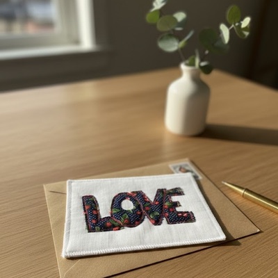 Contrairement aux cartes traditionnelles, cette création est une véritable carte textile, sans papier. Le motif est réalisé en appliqué cousu, avec des finitions soignées à la sujeteuse pour un rendu net et durable.