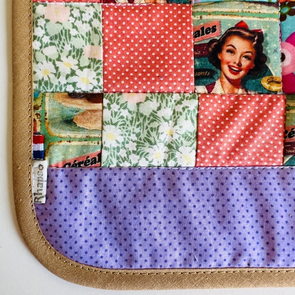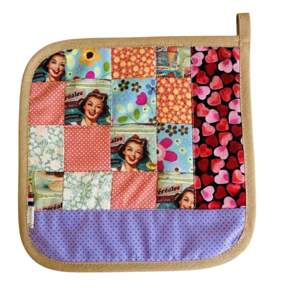 Apportez une touche de couleur et d’originalité à votre cuisine avec cette manique en patchwork entièrement faite main.